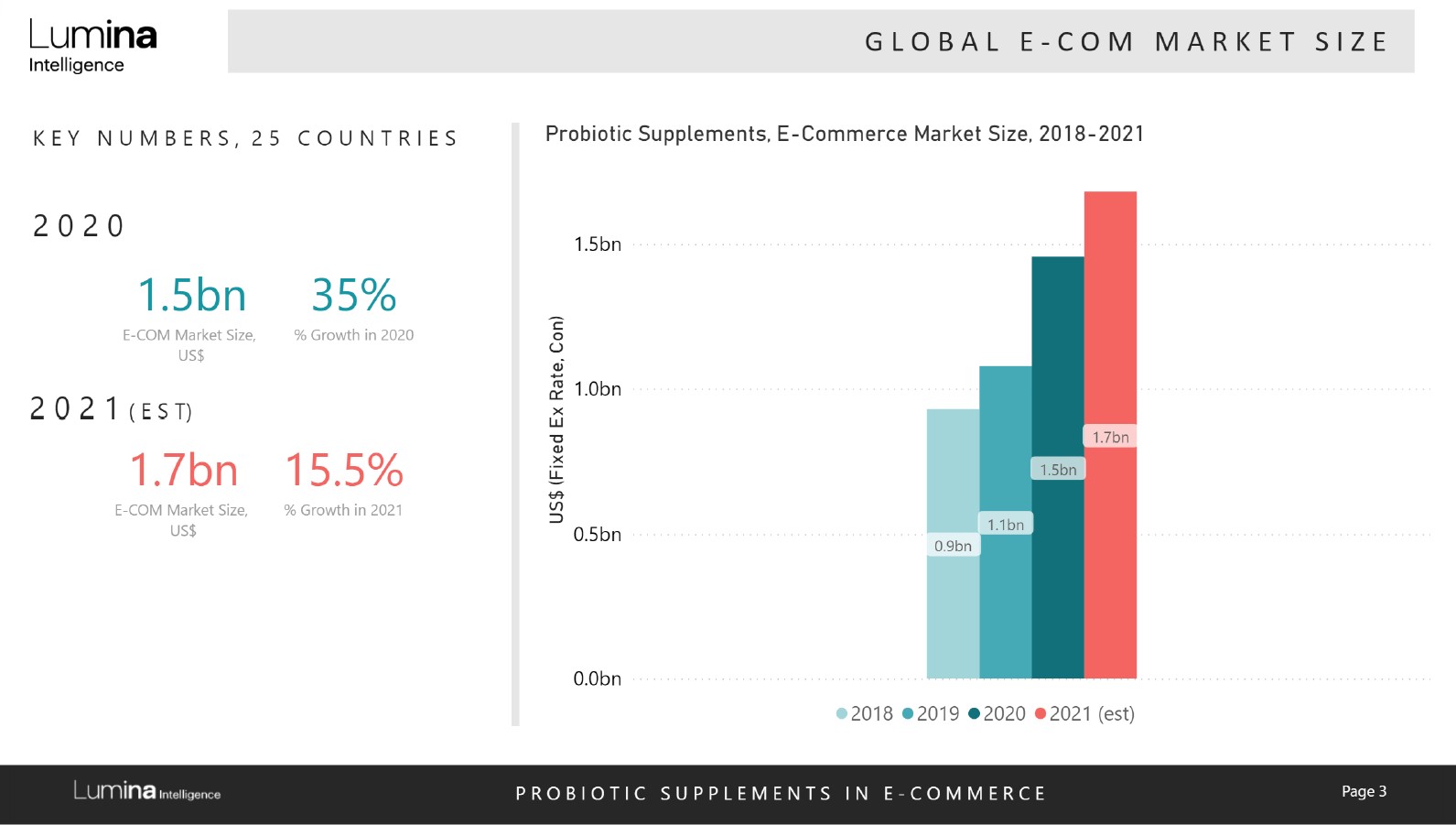 This dataset provides an in-depth analysis of the online probiotic supplements market, which includes the e-commerce sales from 3rd party retailers and own websites. The analysis is based on the valuation of the market size, company shares and brand shares across 25 strategic countries.